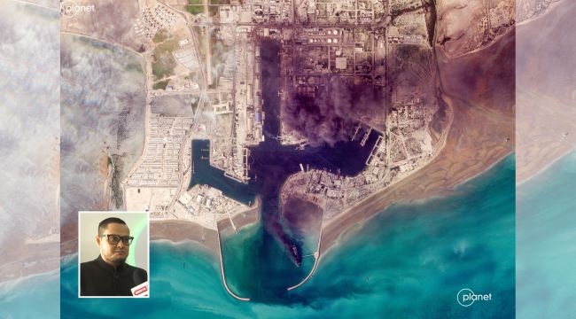 Gambar satelit diambil pada 2 Mac lepas menunjukkan asap tebal susulan letupan di pelabuhan Abbas City,Selat Hormuz/AFP (Foto kecil: Dr Mohd Ramlan Mohd Arshad)