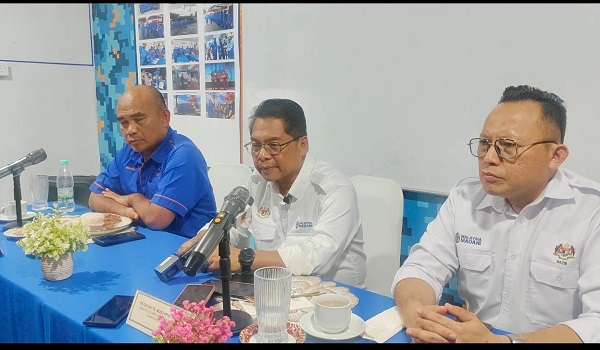 Datuk Mustapha Sakmud bercakap pada sidang media selepas lawatan ke Pusat Kawalan Operasi Daerah Miri APM