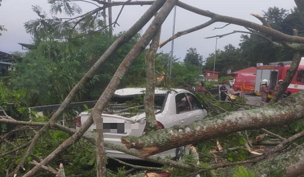 KENINGAU,8 September - Dua kenderaan rosak selepas dihempap sebatang pokok tumbang di kawasan Tamu Ground,di sini,pagi tadi.
