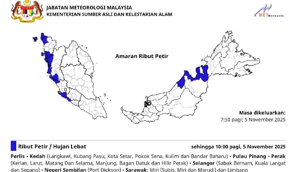 KUALA LUMPUR,5 November - Jabatan Meteorologi Malaysia (MetMalaysia) hari ini mengeluarkan amaran ribut petir,hujan lebat dan angin kencang yang dijangka melanda beberapa negeri sehingga pukul 10 pagi ini.