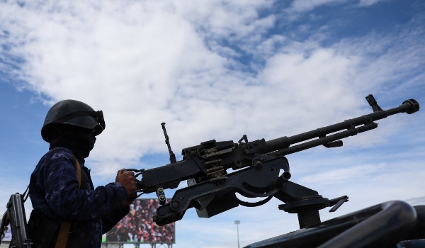 Anggota polis Houthi berkawal dengan senjata api automatik ketika perhimpunan solidariti menyokong Iran di Sanaa,Yaman/Foto REUTERS